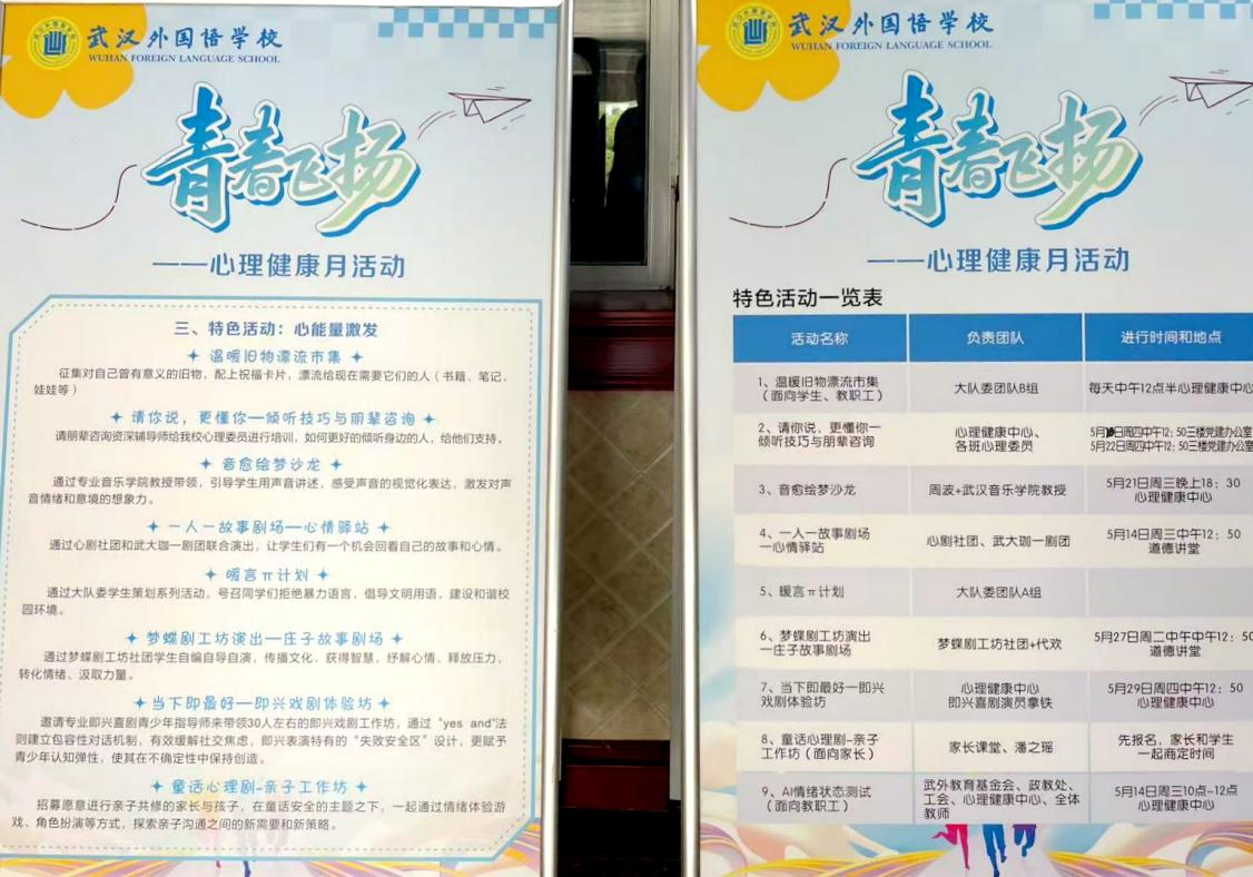 春风含笑催新绿,情绪护航正当时。5月15日上午,武汉外校初中部教学楼中庭内,“青春飞扬文化节”文艺演出正在火热进行,三层楼的走廊上挤满了围观的中学生,音浪迭起,掌声雷动;另一侧的心理中心体验室内,一场关乎“开心指数”的情绪状态测评体验活动也在静静地进行。