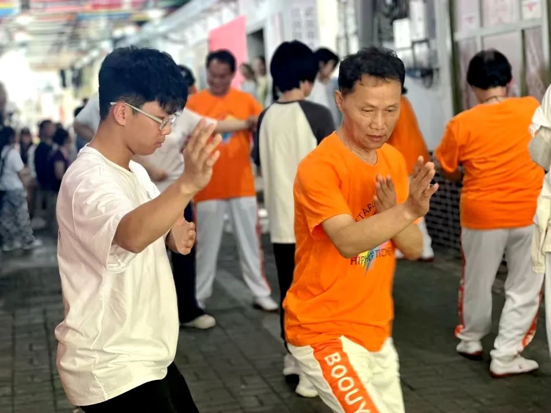 在鱼门拳教学区,老师们耐心地向学生们讲解拳法要义,手把手示范“樵夫砍柴”“渔翁撒网”等招式,教大家掌握沉肩坠肘、虚实转换的要领。经过十分钟的学习,学生们自信展示,出拳刚劲有力,将传统拳法演绎得有模有样,赢得现场居民阵阵喝彩。