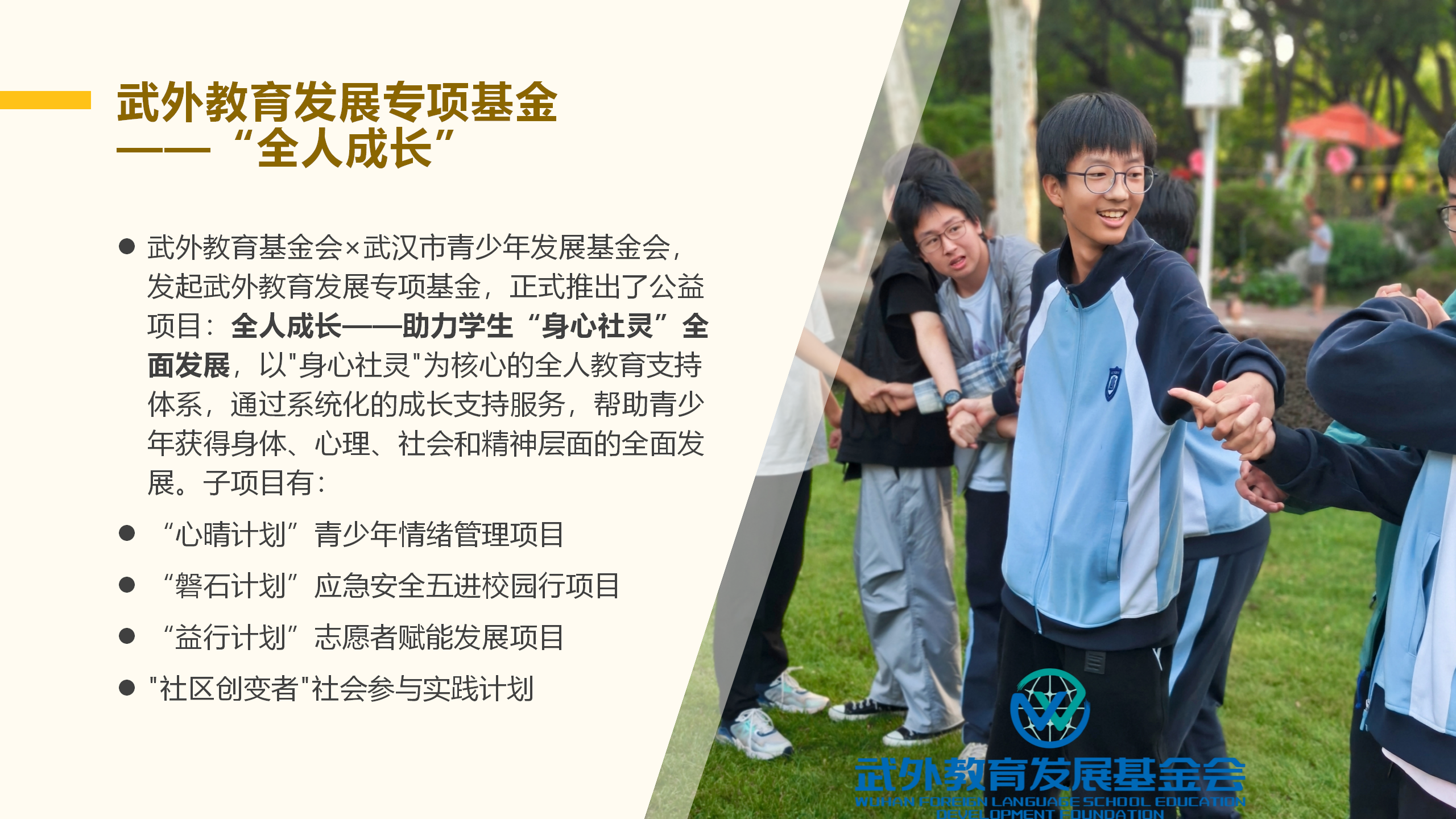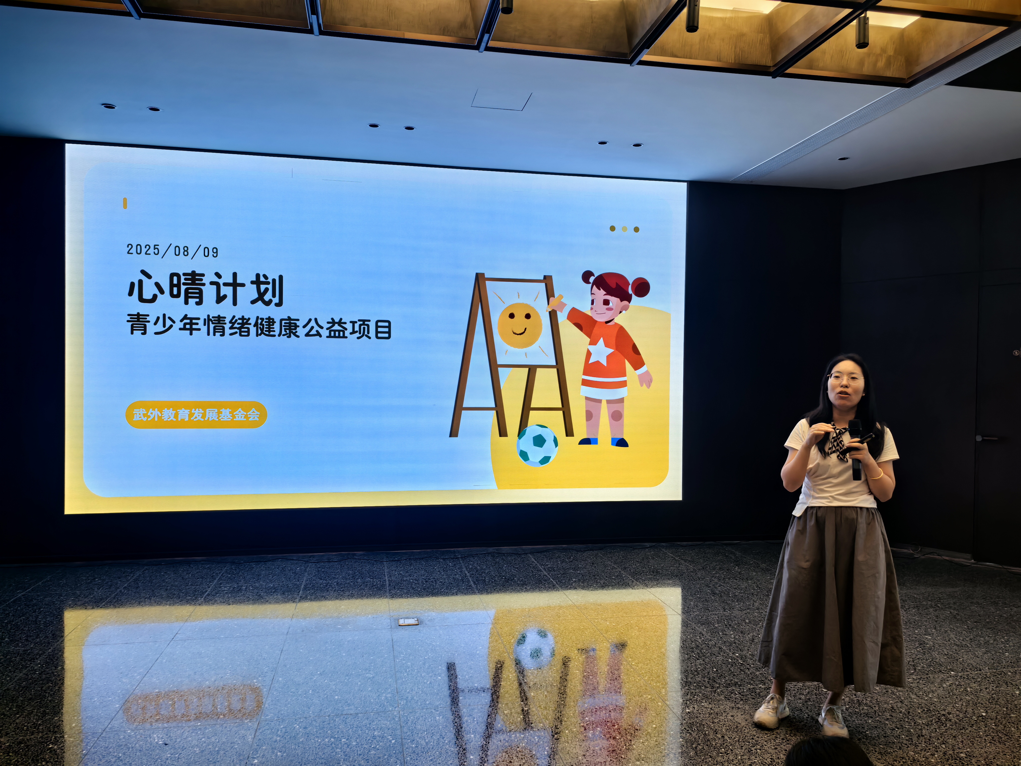 “我们致力于青少年的“身心社灵”全面发展。我们将通过科学干预,让情绪问题止于萌芽。”武外教育基金会邢媛媛老师向大家详细的介绍基金会针对青少年健康成长和武汉市青少年发展基金会共同发起的“全人成长”专项基金。